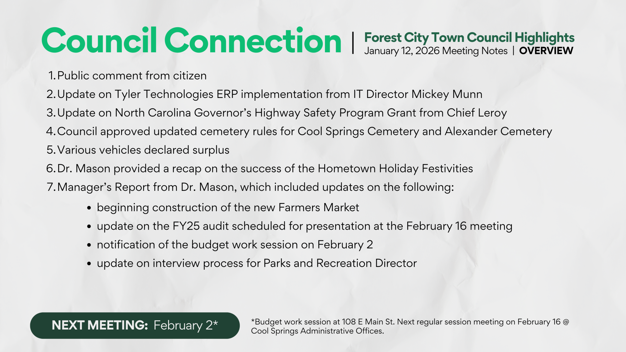 Council Connection: Recap from Forest City Board of Commissioners Meeting January 12, 2025