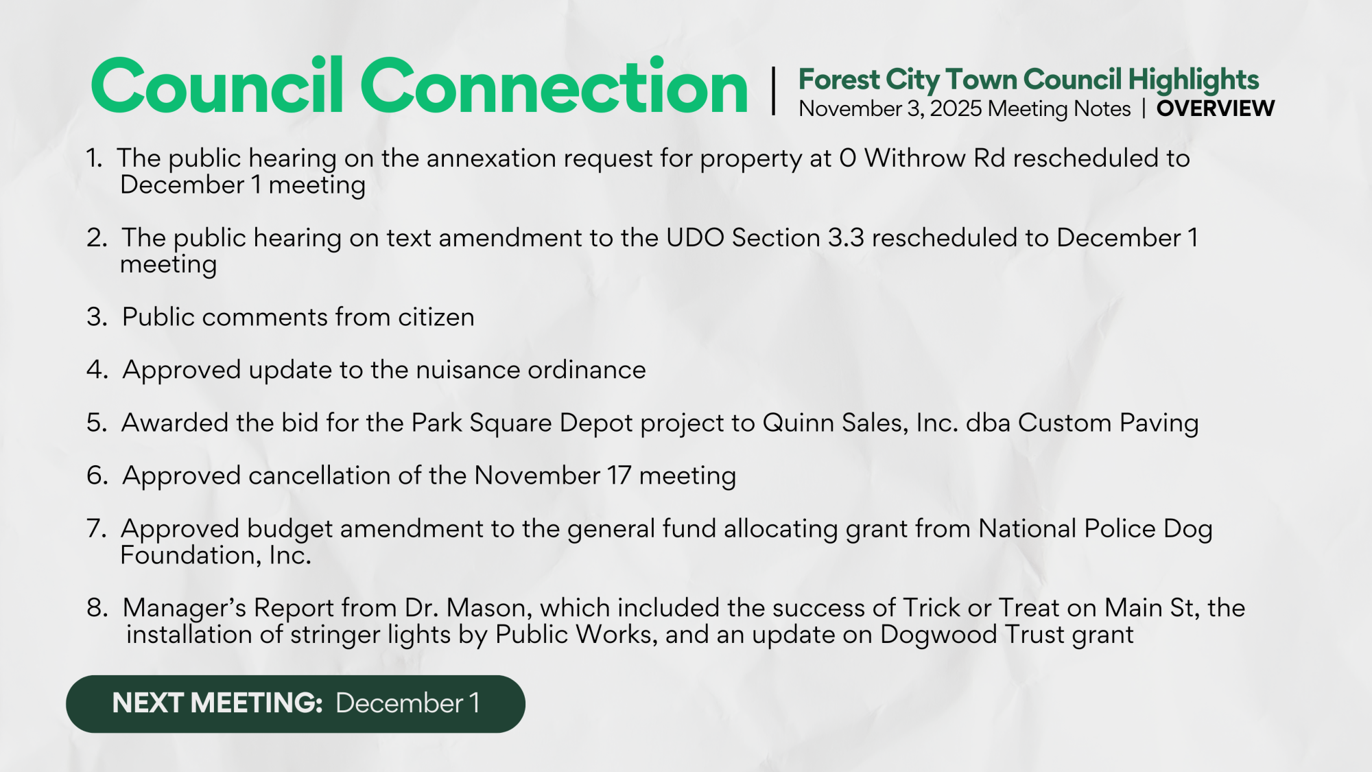 Council Connection: Recap from Forest City Board of Commissioners Meeting November 3, 2025