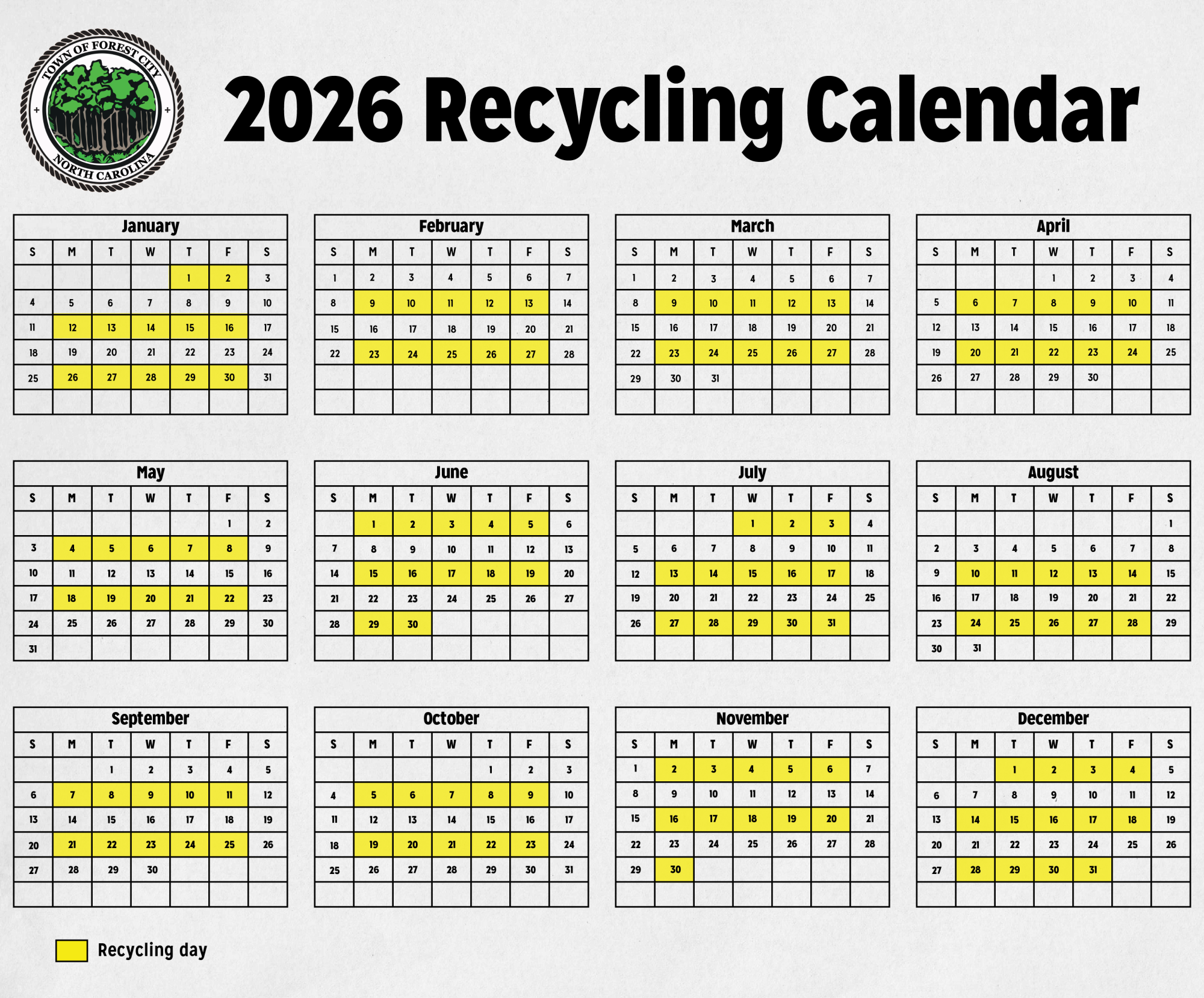 The new recycling program began on March 19, 2018. The Town of Forest City contracts with Republic Services for garbage and recycling.